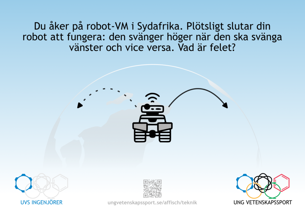Det finns naturligtvis många olika möjligheter, men en möjlighet har att göra med hur roboten definierar höger, vänster, upp och ned. Ett sätt är genom att mäta jordens magnetfält och med hjälp av det definiera vad som är upp och vad som är ned. I Sydafrika är magnetfältets normalriktning motvänd vad den är i Sverige — upp blir ner och vänstersväng blir högersväng! Ett annat sätt att se på det är att roboten försöker göra en vänstersväng fast som om den vore i Sverige (och relativt Sverige är den uppochned). (Problemet är inspirerat av Fredrik Löfgren som faktiskt upplevde detta under VM i robotik). Tyckte du detta problem var roligt, vill ha en mer utförlig förklaring eller fler utmaningar? Bli medlem i en förening och gå med i vår discordserver!