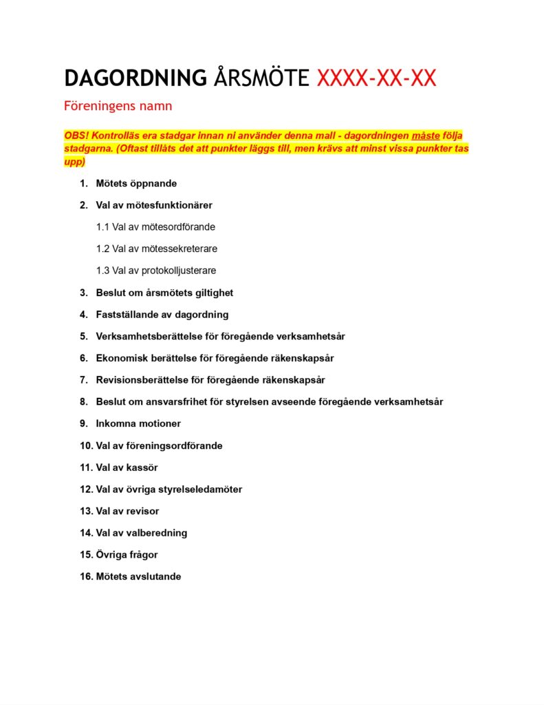 Dagordning för årsmöte skickas normal ut inför årsmötet.