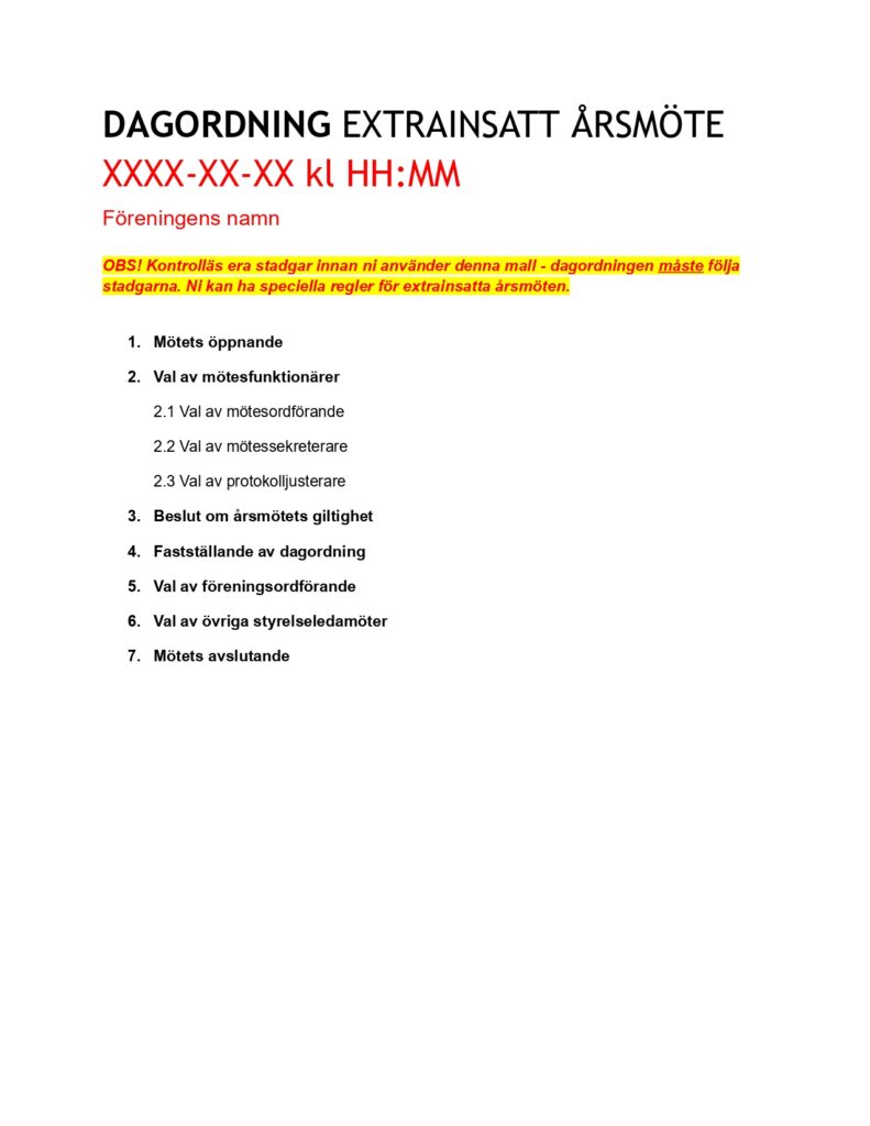 Dagordning extrainsatta årsmöte