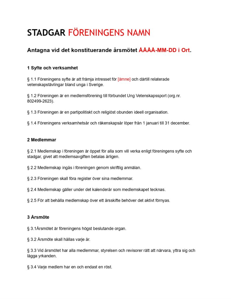 Exempel på stadgar för en ideell förening, lik den UVS medlemsföreningar använder.