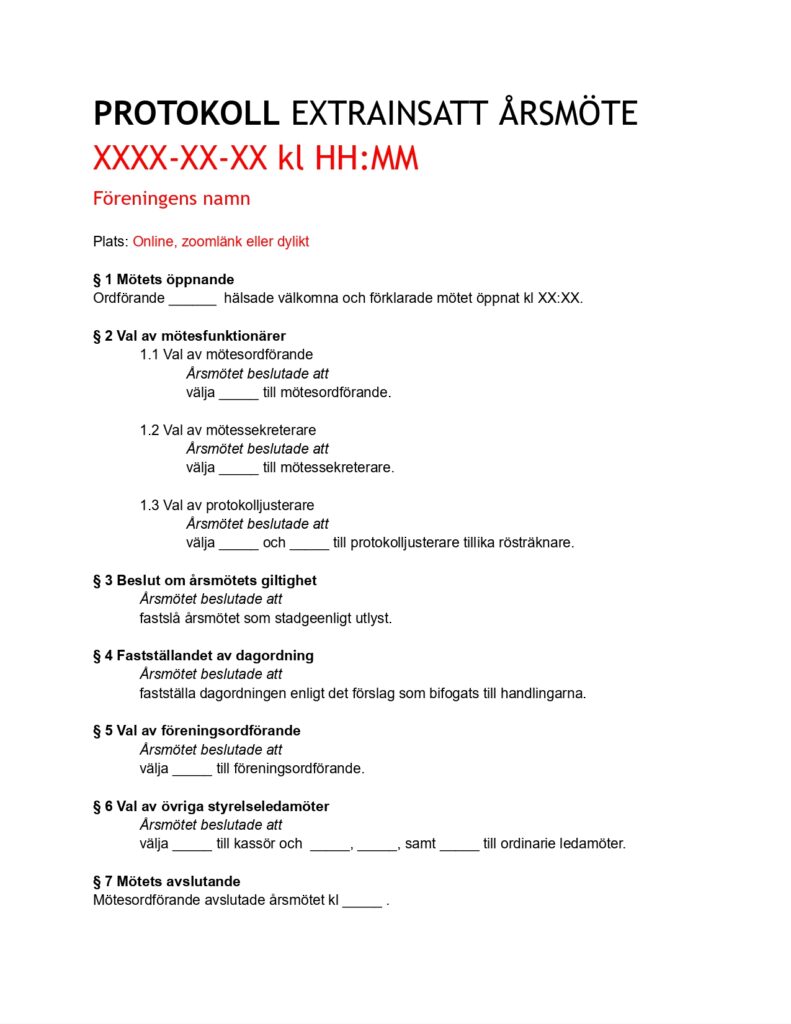 Protokoll från ett extrainsatt årsmöte.